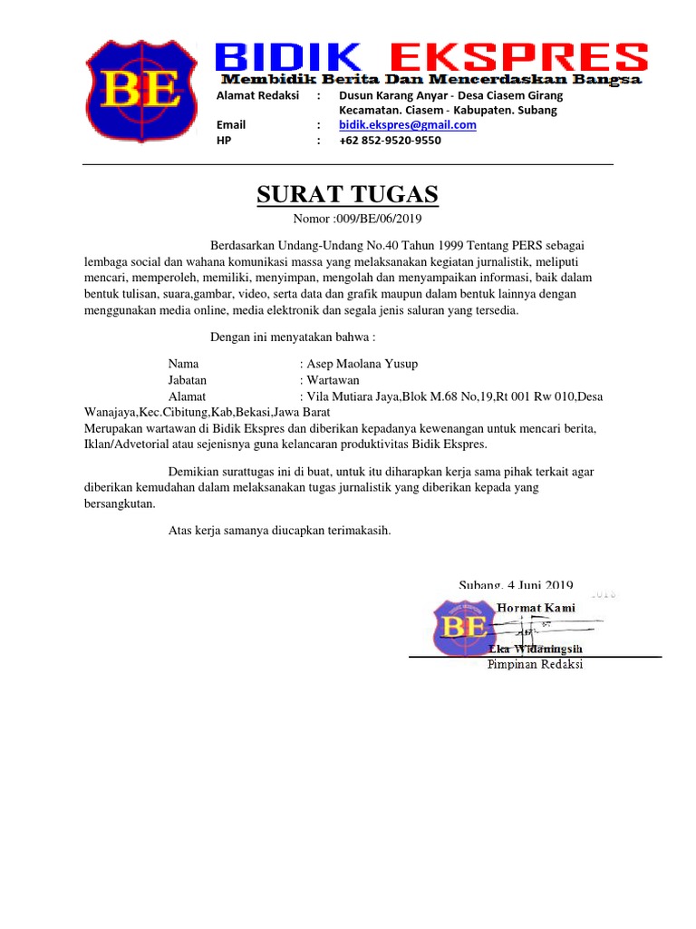 Contoh Surat Tugas Kerja Wartawan Nusagates